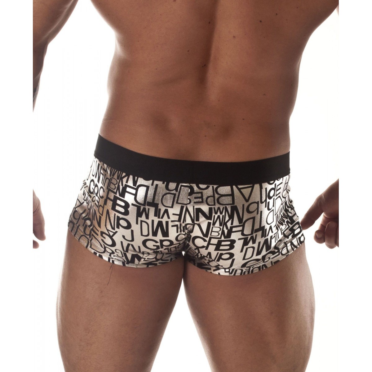 Серебристые трусы-хипсы с черными буквами.
