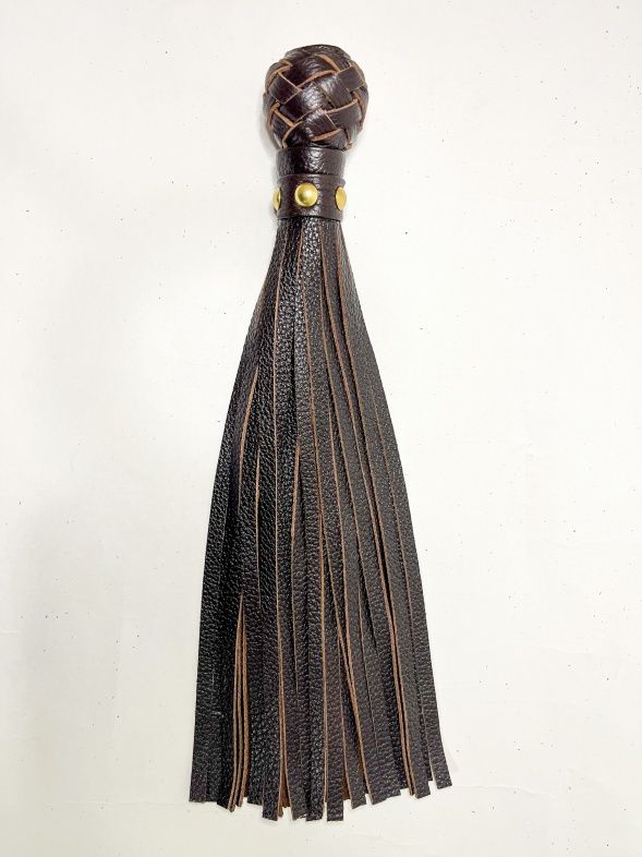 Изящная генитальная плеть, выполненная из натуральной кожи коричневого цвета. Мини-рукоятка декорирована плетением и металлической фурнитурой, очень комфортно ложится в руку! Общая длина аксессуара 30см. Плеть очень красивая, стоит только взять ее в руки, и уже не хочется отпускать. Эта малышка добавит огня и новых впечатлений в любовную игру!