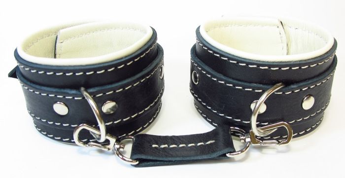 Оковы на руки с бежевым подкладом. Выполнены из толстой ременной кожи черного цвета, подклад мягкая перчаточная кожа светло бежевого цвета. На пряжке. Использована усиленная металлическая фурнитура. Строчка толстой ниткой контрастного светлого цвета.