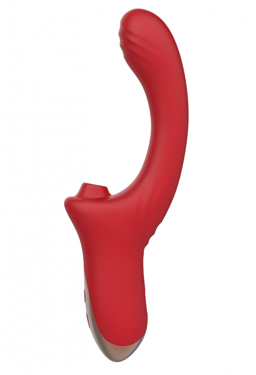 Красный вагинально-клиторальный вибратор. 10 режимов вибрации и 10 режимов посасывания в клиторальном отростке. Рабочая длина - 15,5 см.